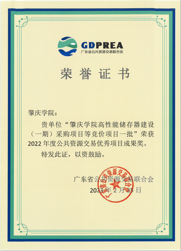 据悉,本次活动共评选出“广东省 2022 年度公共资源交易改革创新优秀成果奖”8 个,“广东省 2022 年度公共资源交易优秀项目成果奖”56 个。我校申报教育设备更新改造项目“必赢242net官网高性能储存器建设(一期)采购项目等竞价项目一批”荣获2022年度公共资源交易优秀项目成果奖。
