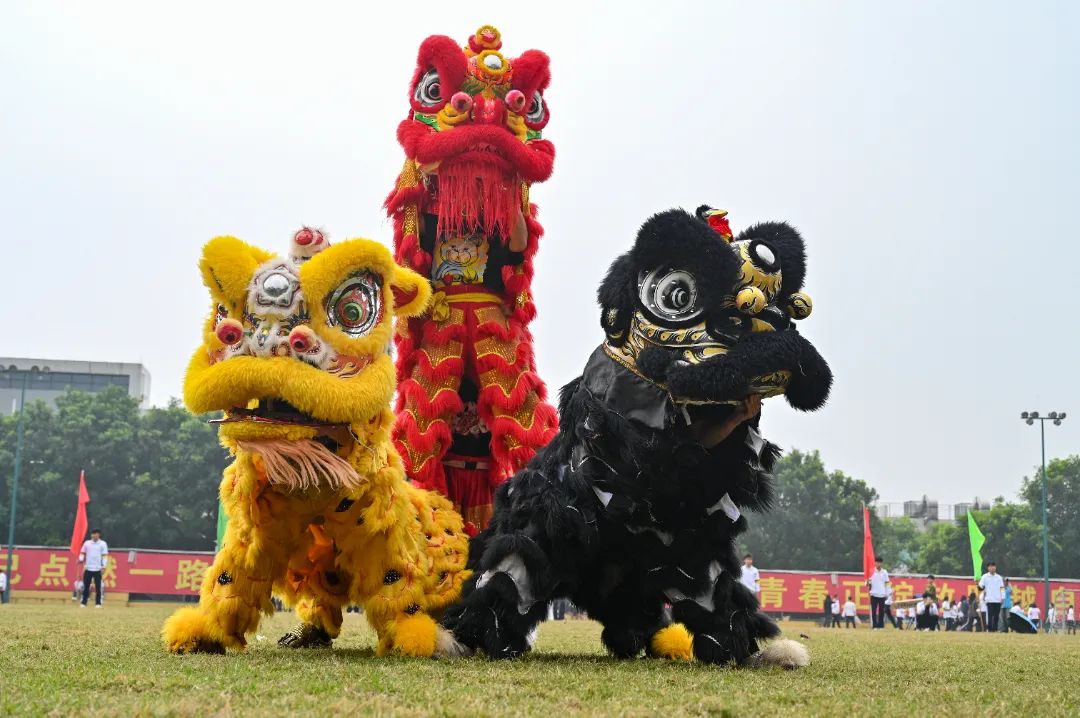 舞龙队队员与舞狮队队员们