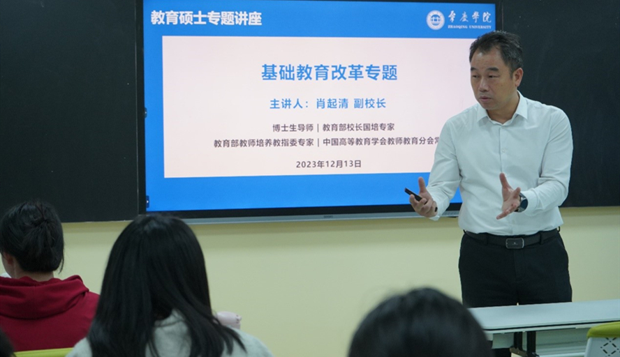 本网讯 副校长肖起清近日以“基础教育改革专题”为题,对教育硕士研究生开展专题讲座, 2023级教育管理方向、学科教学思政方向、学科教学语文方向和学科教学数学方向全体教育硕士共40多人参加,教育科学学院副院长文雪主持。