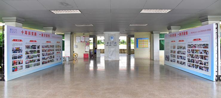 图片展显示,过去10年,我校按照上级部门的要求,在广宁的三坑、横迳、横山三地开展扶贫工作。通过不懈努力,我校对口帮扶的贫困群众收入水平大幅度提高,自主脱贫能力稳步增强,贫困群众“两不愁”质量水平明显提升,“三保障”突出问题得到总体解决,义务教育、基本医疗、住房安全有了基本保障。我校围绕扶贫工作扛起的责任、投入的爱心,结出了累累硕果。