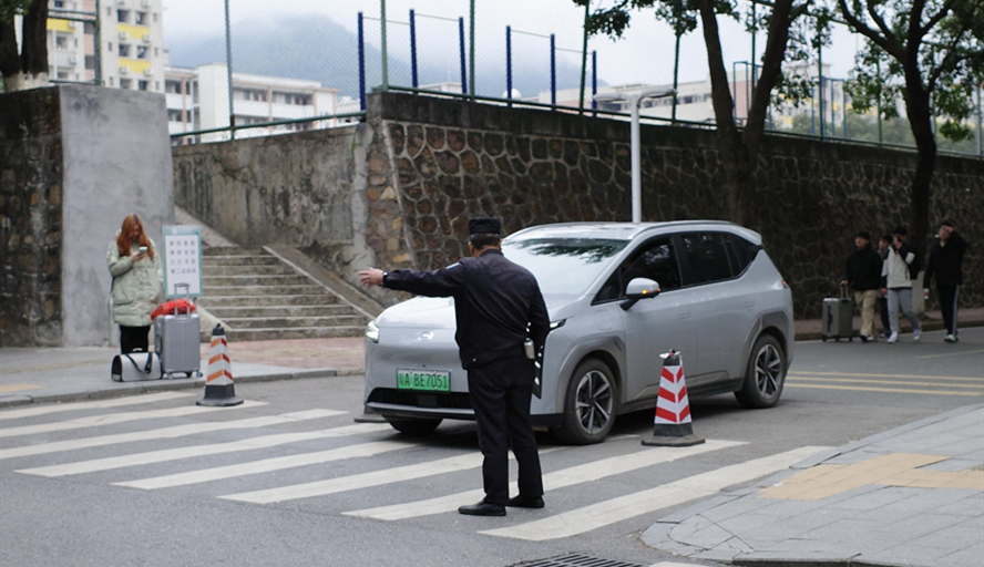 学生新学期返校期间,校卫队员、志愿者在校园内重点路段、主干道进行交通疏导,密切关注实时路况,引导车辆停靠至指定区域落客后及时驶离,校园整体交通情况整体畅通、井然有序 。