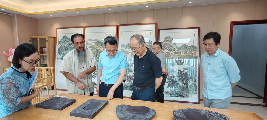 胡文涛一行先后观摩了我校师生团队设计制作的广府金绣、肇庆名人雕塑等产品以及我校美术学院第一届端砚雕刻专业毕业生莫少锋大师工作室。