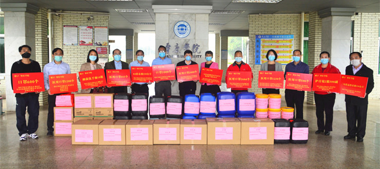 校党委书记曾桓松,校党委副书记、纪委书记黄劲松出席简洁的捐赠仪式,并与黄得平一行亲切合影。曾桓松与黄得平进行了交流,代表学校感谢东莞校友在疫情防控关键时刻,心系母校,慷慨解囊,为母校提供防控物资,同时祝愿广大东莞校友通过努力,在各自的行业、各自的岗位取得更大的成就,为社会贡献力量,为母校增光添彩。他表示,在全体师生和广大校友的共同努力下,一定能够战胜疫情,迎来美好的春天。