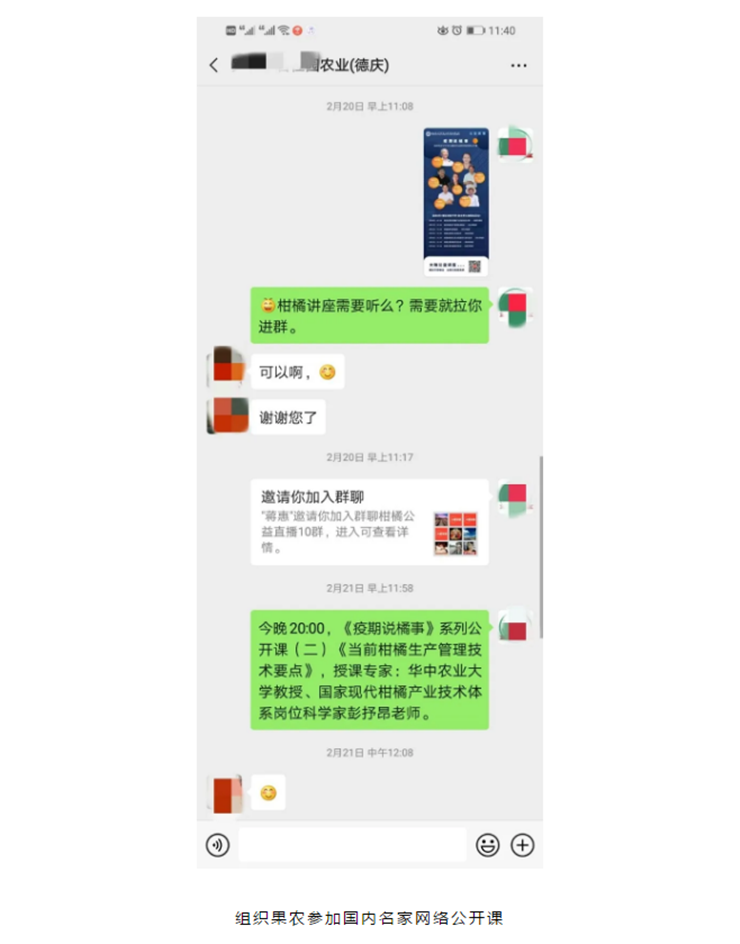 疫情防控期,团队聚焦果农面临的最迫切、最急需解决的问题,紧急“上线”服务,助力果农复工复产。精心制作《沙糖桔春季精细管理技术》课件,提供给农技员、农民免费下载,组织农技人员等参加业界名家线上讲座。通过线上精准对接,指导果农防治柑橘黄龙病。团队共开展电话咨询服务300多人次,线上指导、培训百余人次,解决共性技术问题8项,疫情防控期间科技服务从未间断。