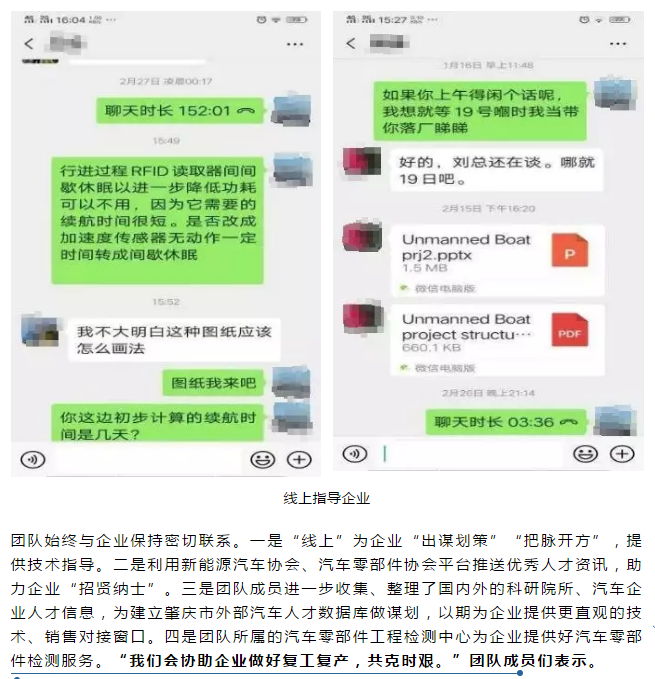团队始终与企业保持密切联系。一是“线上”为企业“出谋划策”“把脉开方”,提供技术指导。二是利用新能源汽车协会、汽车零部件协会平台推送优秀人才资讯,助力企业“招贤纳士”。三是团队成员进一步收集、整理了国内外的科研院所、汽车企业人才信息,为建立肇庆市外部汽车人才数据库做谋划,以期为企业提供更直观的技术、销售对接窗口。四是团队所属的汽车零部件工程检测中心为企业提供好汽车零部件检测服务。“我们会协助企业做好复工复产,共克时艰。”团队成员们表示。
