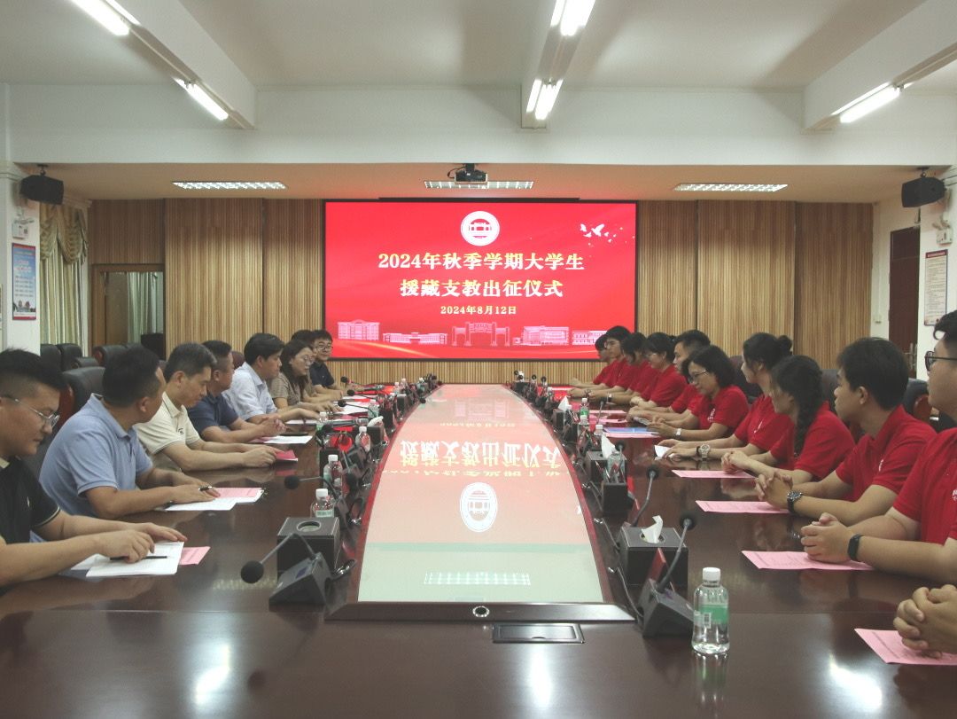 8月12日,我校2024年秋季学期援藏支教出征仪式在临峰厅举行。学校党委副书记欧洪湛、学生工作部班子成员,支教队员所在学院党委负责人、第十四批援藏支教服务队全体成员出席参与,仪式由学生工作部(招生与就业指导中心)部长陈玉华主持。