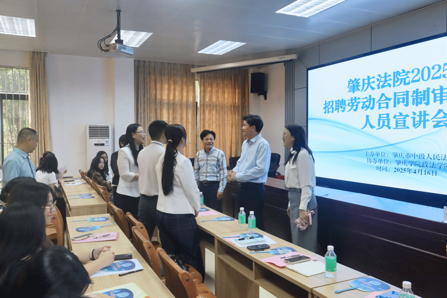 宣讲环节通过播放肇庆法院宣传片,生动展示了法院工作环境与司法实践成果。市法院工作人员系统解读了审判辅助人员的招聘政策、薪酬待遇及职业保障;端州、高要、四会、怀集等基层法院代表则结合区域特色,重点讲解了岗位差异化政策,为学生提供多元化选择。
