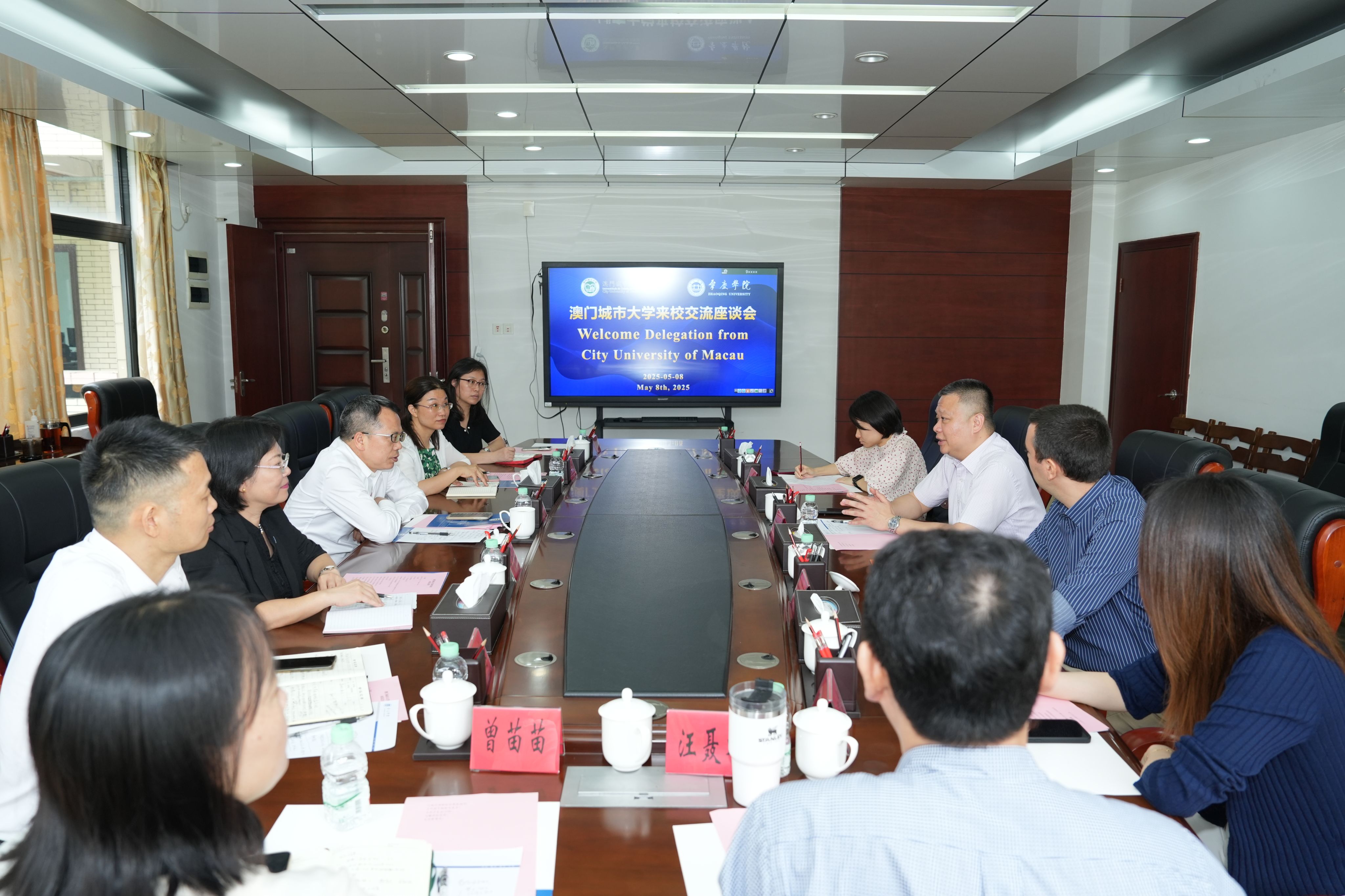 本网讯 5月8日,澳门城市大学副校长叶桂平一行来校就深化两校教育合作进行洽谈交流。副校长胡文涛出席座谈会,港澳台和外事工作部、科学技术部、旅游与历史文化学院、外国语言文化学院、政法学院、教育科学学院等相关单位负责人参加活动。