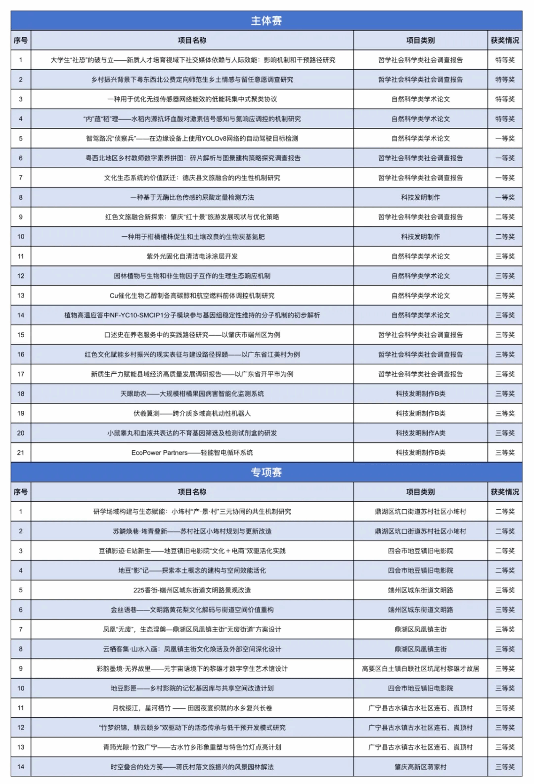 本届竞赛共吸引161所高校、逾20万名大学生参赛,收到科创作品3.6万余件。最终遴选出2074件作品进入省赛,831个项目进入终审决赛。参赛作品涵盖自然科学论文、哲学社会科学调查报告、科技发明制作三大类。本届竞赛还创新设立肇庆“百千万工程”专项赛,推出线上云展。