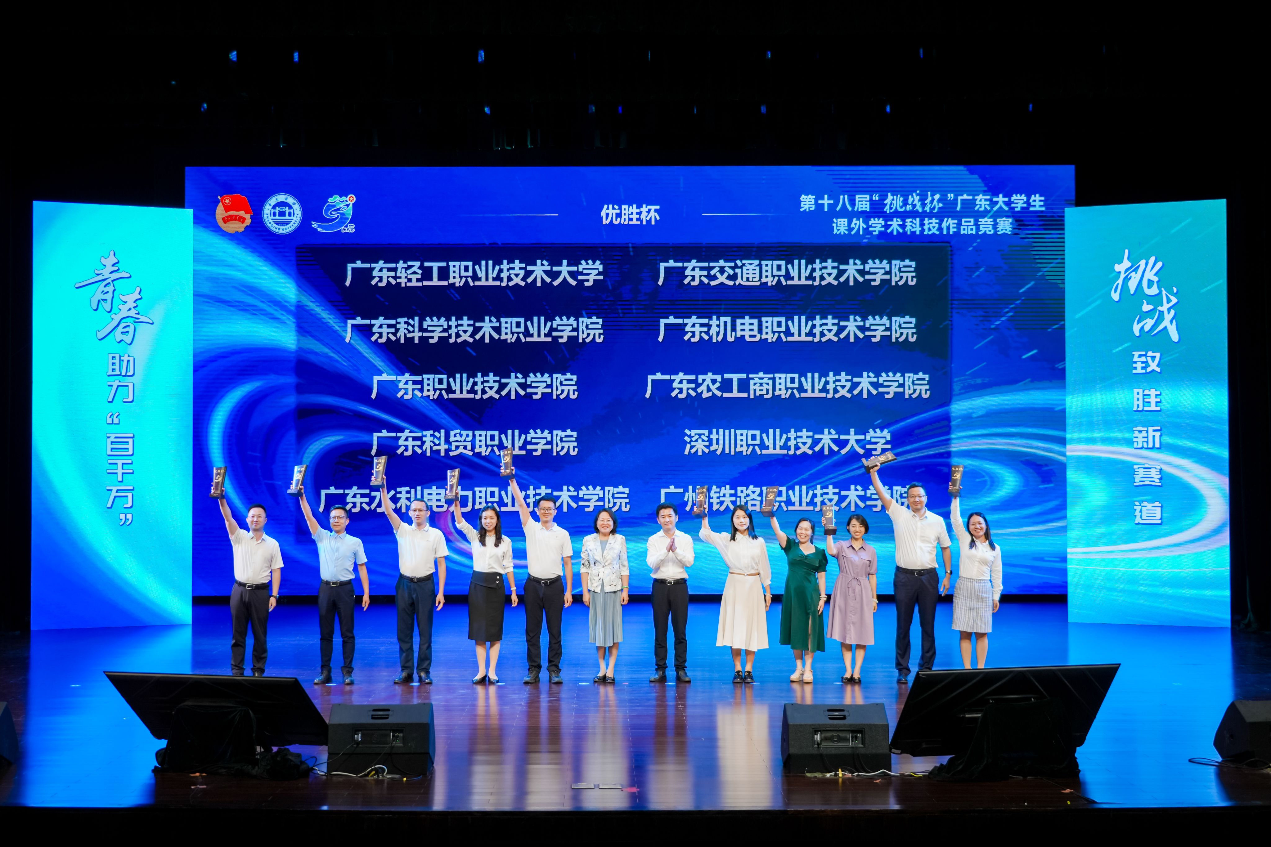 ▲广东轻工职业技术大学、广东交通职业技术学院、广东科学技术职业学院、广东机电职业技术学院、广东职业技术学院、广东农工商职业技术学院、广东科贸职业学院、深圳职业技术大学、广东水利电力职业技术学院、广州铁路职业技术学院等大学捧得“优胜杯”。(职业院校)