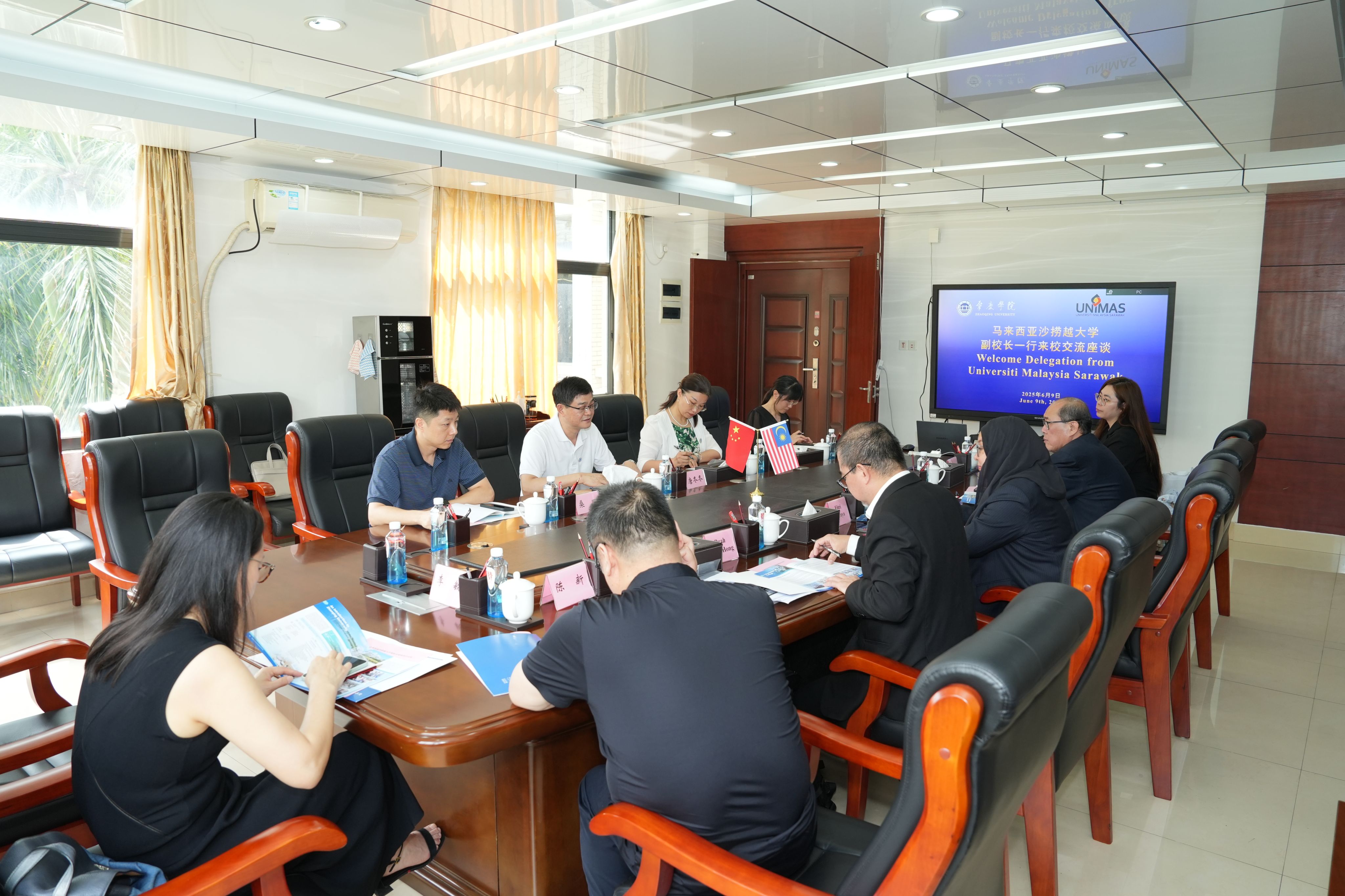本网讯 6月9日,马来西亚沙捞越大学副校长菲特里·苏拉亚一行来校交流。副校长唐冬冬出席座谈,对外交流合作部部长李赛男主持。