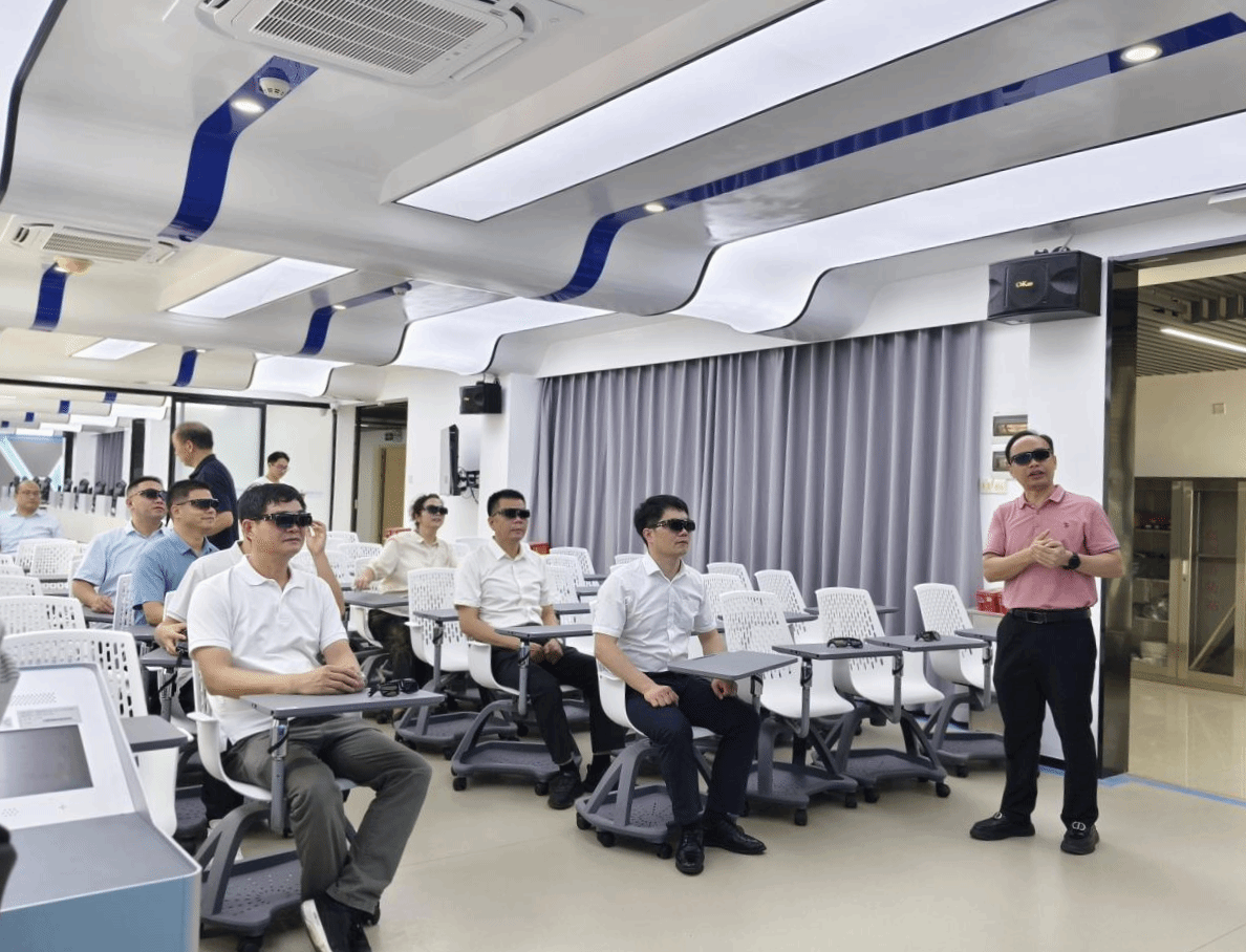 邓小林一行先后参观了肇庆市高端装备先进设计重点实验室、新能源智能网联汽车工程技术中心及学院教学科研实验室,详细了解设施配置、科研进展与实践教学情况。在现代教育技术中心主任张志华介绍下,考察团还走访了虚拟仿真实验室,对学校在高端装备设计、智能网联技术等领域的实验室建设给予高度评价。