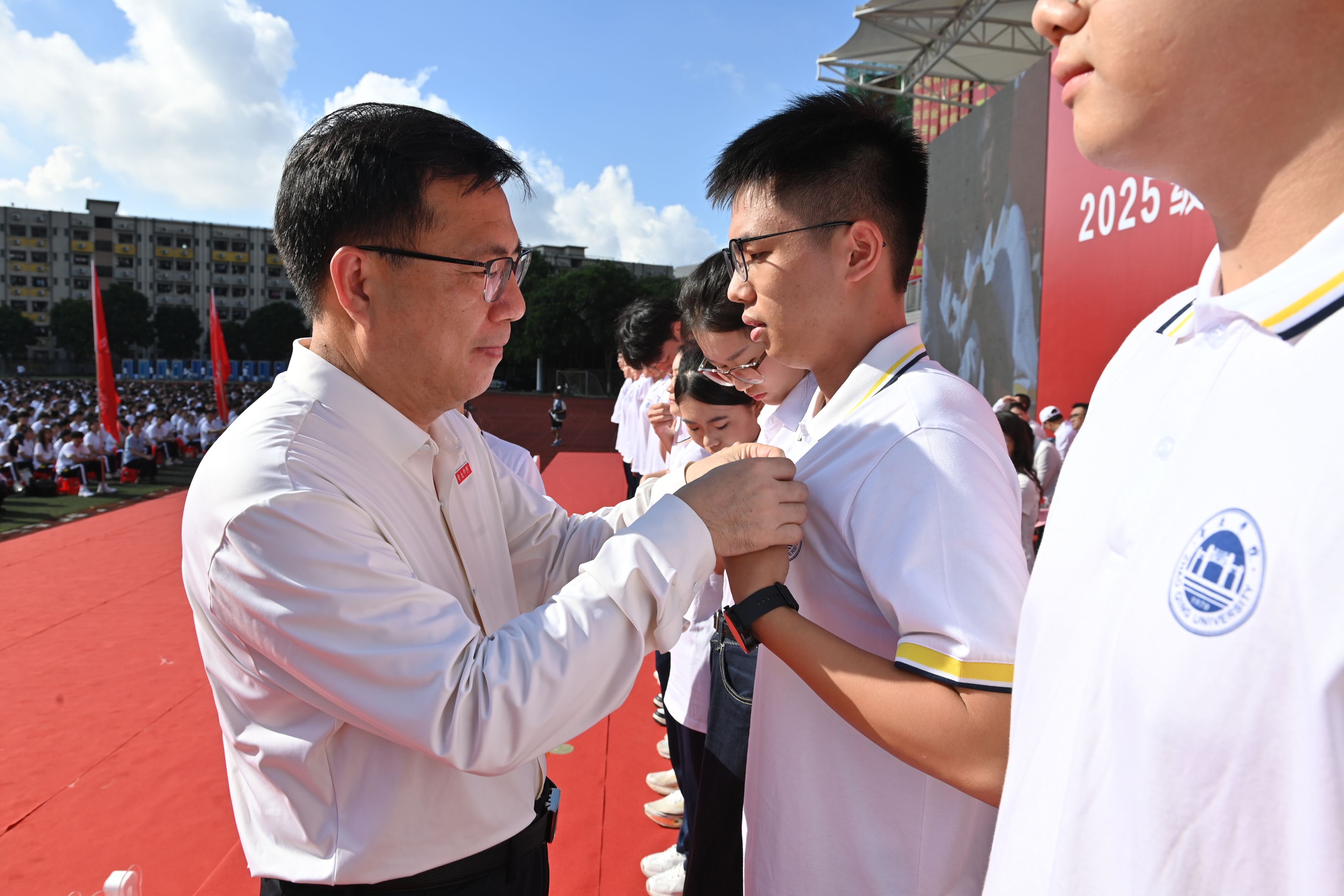 谢冠华为新生代表佩戴学校徽章。这枚熠熠生辉的徽章是必赢242net官网学子们的身份象征,更是一份沉甸甸的责任与期许。他期望新一届砚园人传承“厚德、明智、博学、力行”的校训精神,延续有理想、有情怀、有温度、求卓越的砚园品格,在新时代新征程中勇担重任、续写辉煌。