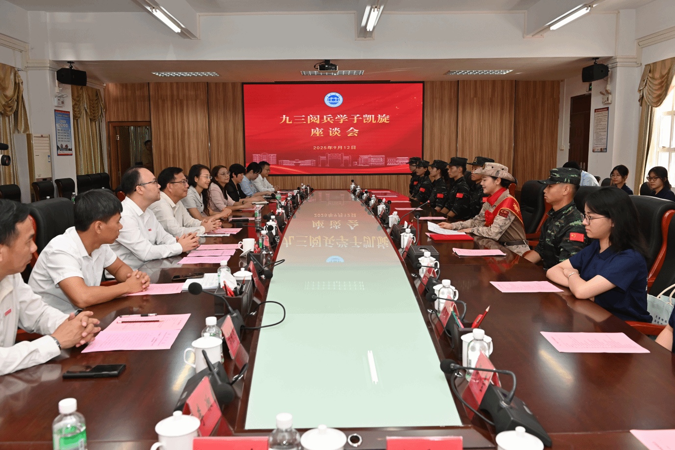 本网讯 9月12日,学校召开九三阅兵学子座谈会,欢迎我校优秀参阅学子王可心荣誉归来。校党委书记谢冠华,校长李琴,学校相关职能部门负责人,环境与化学工程学院党委书记刘远君、院长李湘等班子成员、辅导员及新生军训教官和青马工程学员代表参会。