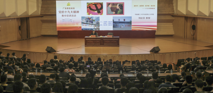 本网讯 为了帮助和促进广大师生进一步学习领会党的十九大精神,12月8日,由广东省委教育工委主办的广东教育系统党的十九大精神集中宣讲活动在我校举行。全省教育系统党的十九大精神集中宣讲团成员、华南理工大学马克思主义学院刘社欣教授担任主讲人,校党委副书记叶峥嵘主持,来自全校各级党组织的党员干部、师生代表400余人出席。