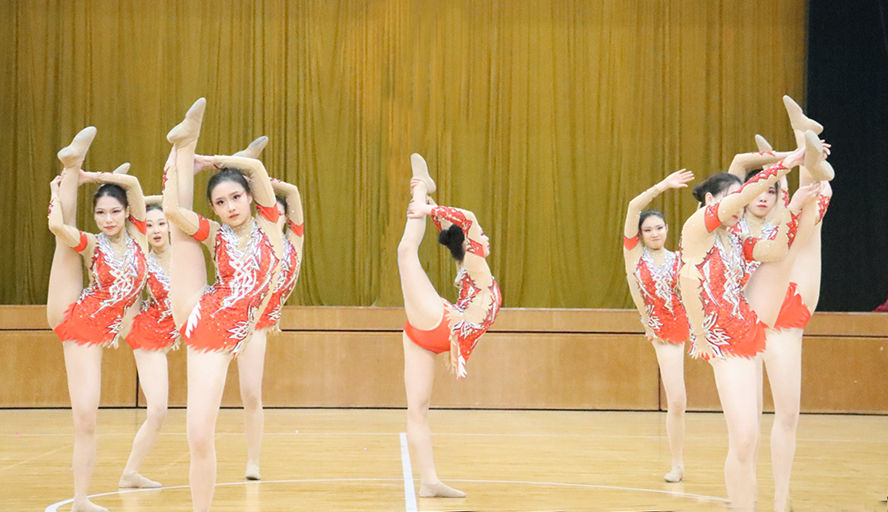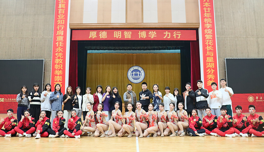 在疫情防控常态化的情况下,大赛采取线上云比赛形式进行,评委通过观看现场直播对各参赛队伍进行打分。以体育与健康学院的24名学生为主要力量,再加上11名音乐学院学生、2名教育科学学院学生,组成了我校代表队出征本次比赛。体育与健康学院的马国锋、周文达两位专业教师担任指导老师。特别值得一提的是,马国锋同时还应主办单位邀请,担任本次大赛副裁判长。