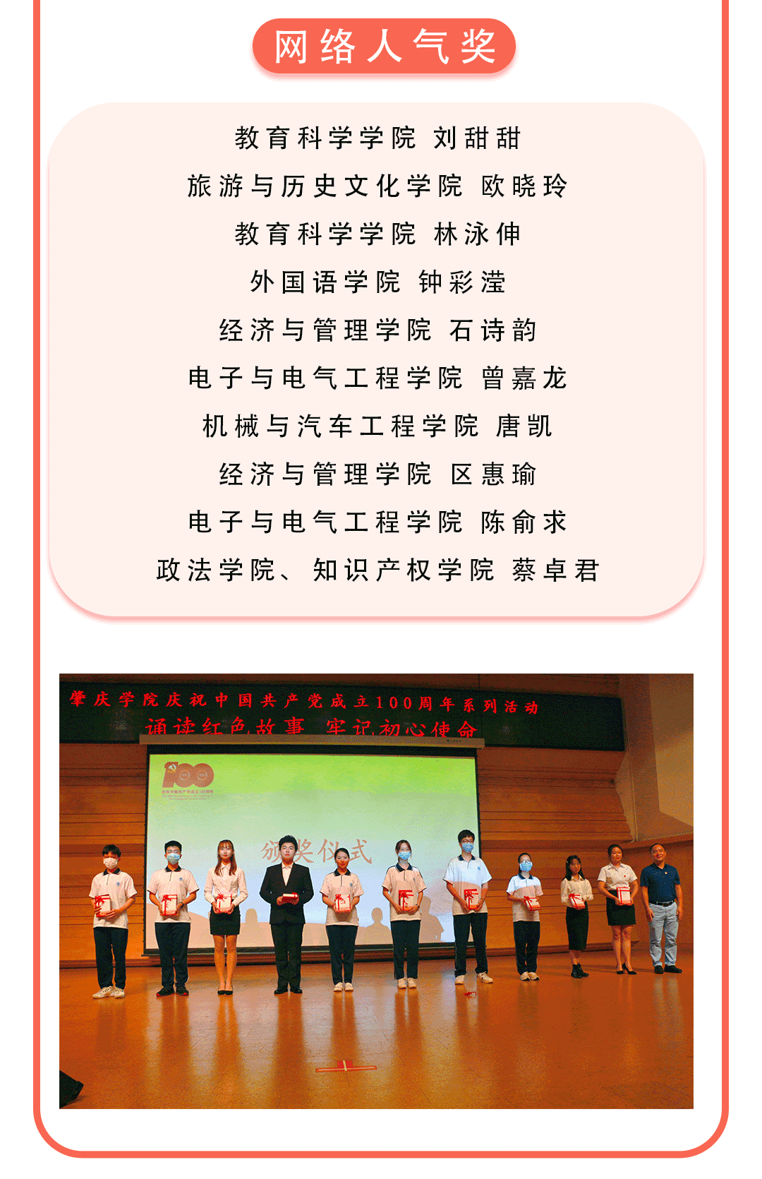 这一百年里涌现出许多人物,有些可能是载入史册的大英雄,有些可能是默默无闻的小人物,但每一个人都是共和国伟业的铸造者。我们想通过这次的朗诵向观众展现这样一群为了心中共同的理想流血牺牲、付出辛勤汗水的人们,我们想要歌颂这样一群“人民英雄”,他们值得我们永远铭记,人民英雄永垂不朽!我们身为未来的人民教师,也将带着这份使命,将先辈们的故事传承下去,让每一代人都记住他们、怀念他们。