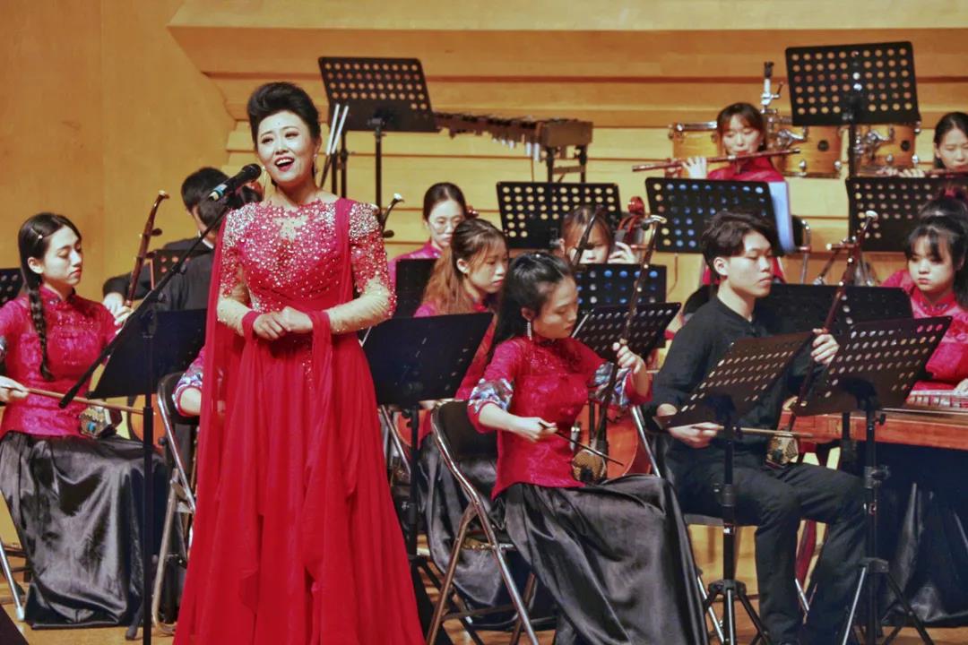 校民族乐团首先亮相,在乐团指挥许嵩老师的带领下,以一首《唱支山歌给党听》拉开了演出的序幕。二胡、琵琶、古筝、竹笛等乐器配合娴熟,将歌曲演绎得真挚而动人。音乐学院副教授郑以漩登场演唱了《洪湖水浪打浪》,处理细腻,婉转悠扬,把现场观众带回到那个奋斗的革命年代。随后,一首大气磅礴的《盛世国乐》,抒发出师生对党的光辉历史的真情歌颂,也展现了中华文化厚重的底蕴和蓬勃的生命力。