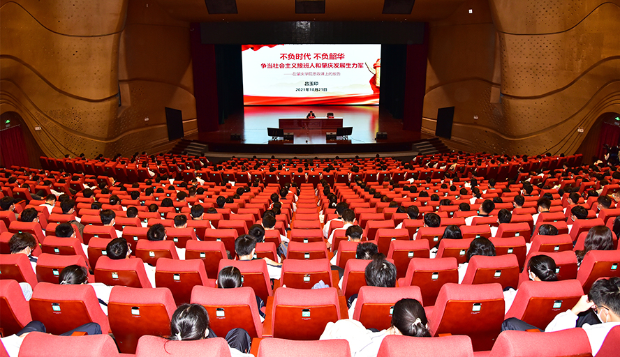 本网讯 10月21日,市委书记、市人大常委会主任吕玉印来到我校,为师生们讲授思想政治理论课。他结合肇庆的今昔,回顾党的百年奋斗历程,畅谈学习贯彻习近平总书记“七一”重要讲话精神的心得体会,勉励广大青年学生响应总书记的号召,不负时代、不负韶华,争当社会主义接班人和肇庆发展生力军。