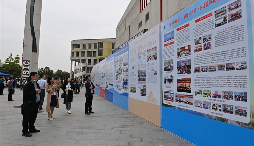 与会人员查看“新师范”建设展板和实际成果