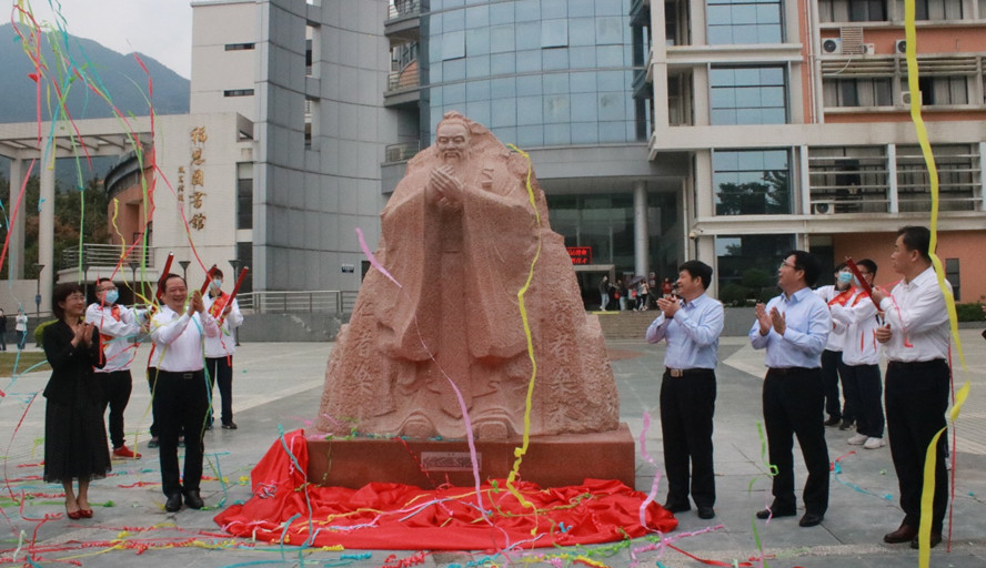 本网讯 11月19日,孔子像揭彩仪式在福慧图书馆广场举行。当天来校参加广东省“新师范”建设总结大会的教育厅副厅长李璧亮,校党委书记曾桓松,副校长肖起清等领导出席活动,共同为孔子像揭幕。据悉,该孔子像由广东当代艺术基金会捐赠。