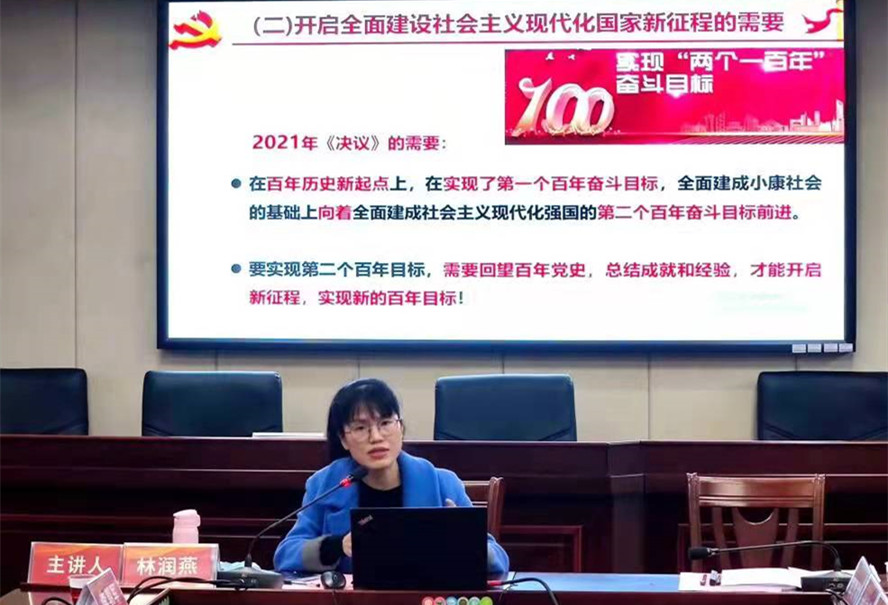 在学习会上,林润燕从党的百年奋斗重大成就和历史经验总结的时代背景、党的百年奋斗重大成就的科学概括、党的百年奋斗理论思想的科学定位、党的百年奋斗基本经验和历史意义的深刻总结四个方面对党的十九届六中全会《决议》进行了深刻解读,结合党务工作者的岗位职责,勉励大家要在新的长征之路上,必须保持战略定力,拥有咬定青山不放松的勇气,为实现学校高质量发展不断努力奋斗。