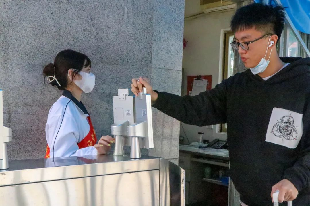 26日一早起,陆续有学生到校。机关党员志愿者和学生志愿者积极协助新生报到,引导学生进校完成身份核验、体温检测与口罩换发,并进行行李消毒。
