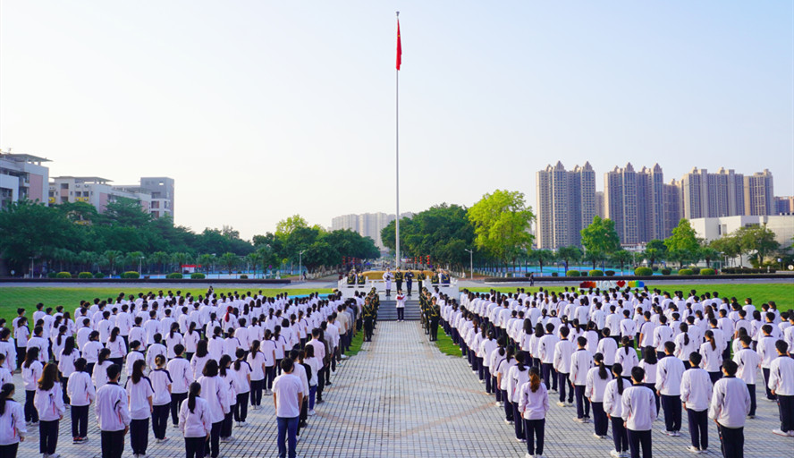 早上7时,在全场师生的注目下,英姿飒爽的国旗护卫队迈着整齐的步伐护送鲜艳的五星红旗进场。伴随着雄壮的国歌,五星红旗在晨光中冉冉升起,在砚园上空迎风飘扬。