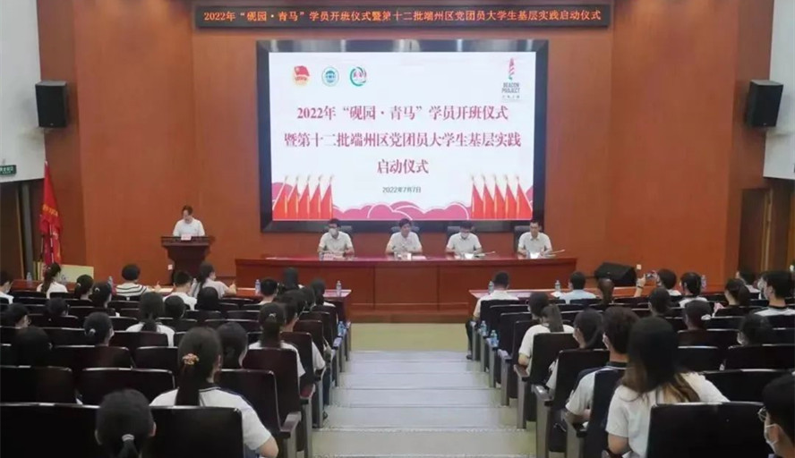 我校举行2022年“砚园·青马”学员开班仪式暨第十二批端州区党团员大学生基层实践启动仪式。仪式上,校团委副书记(主持全面工作)马舒洁回顾了2021年青马班的成果。校党委委员、组织部部长欧洪湛颁发“优秀学员”荣誉证书,团端州区委书记王烁颁发2022年青马班学员的录取通知书。欧洪湛在会上讲话,肯定我校“青马工程”学员培养的工作成效,鼓励新学员要坚定理想信念,加强理论素养,做一名马克思主义的忠实拥护者;勤奋刻苦学习,坚持知行合一,做一名马克思主义的坚定实践者;争当先锋模范,甘于奉献社会,做一名马克思主义的积极传播者,用青春激情和不懈的努力唱响为端州区组织建设志愿服务倾情奉献的主旋律。