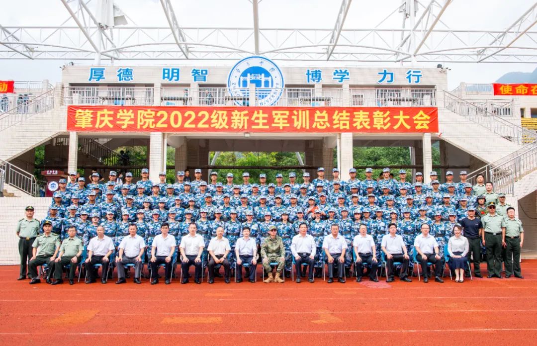 本网讯 9月30日,2022级新生军训总结表彰大会在第二田径运动场隆重举行。肇庆军分区司令员张军大校,校领导曾桓松、黄劲松、谢冠华、肖起清、李新昌、唐冬冬、胡文涛,广东工业大学帮扶队队长刘怡军,学校党委委员欧洪湛、谭冠中、陈前出席,并与学校军训工作领导小组成员和各二级学院党委书记、院长在主席台就坐。大会由武装部部长、军训团团长黄镜辉主持。
