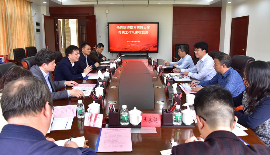 本网讯 2月23日,校长吴业春会见来校交流的南方医科大学驻广东医科大学帮扶工作队队长李凌一行。校党委副书记谢冠华、广东工业大学帮扶工作队队长刘怡军,校党委委员、党委组织部部长欧洪湛出席座谈会,两校帮扶工作队全体队员参加。