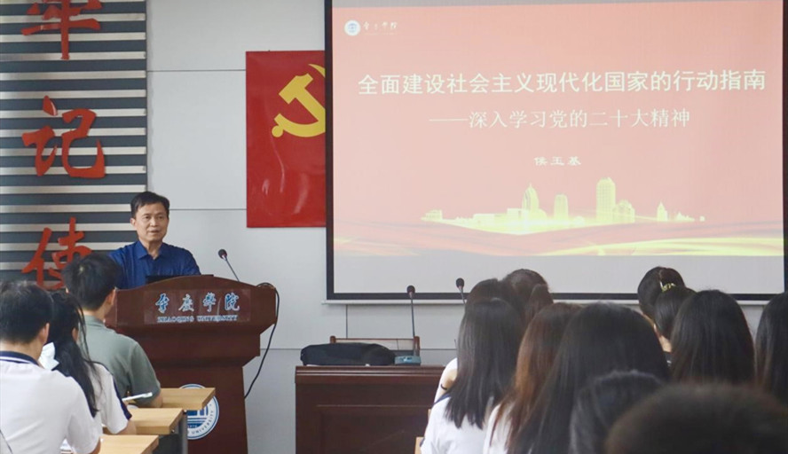本网讯 3月8日,政法学院党委书记侯玉基以“全面建设社会主义现代化国家的行动指南——深入学习党的二十大精神”为主题,在学生活动中心三楼初心堂为政法学子开讲2023年春季学期“思政第一课”。