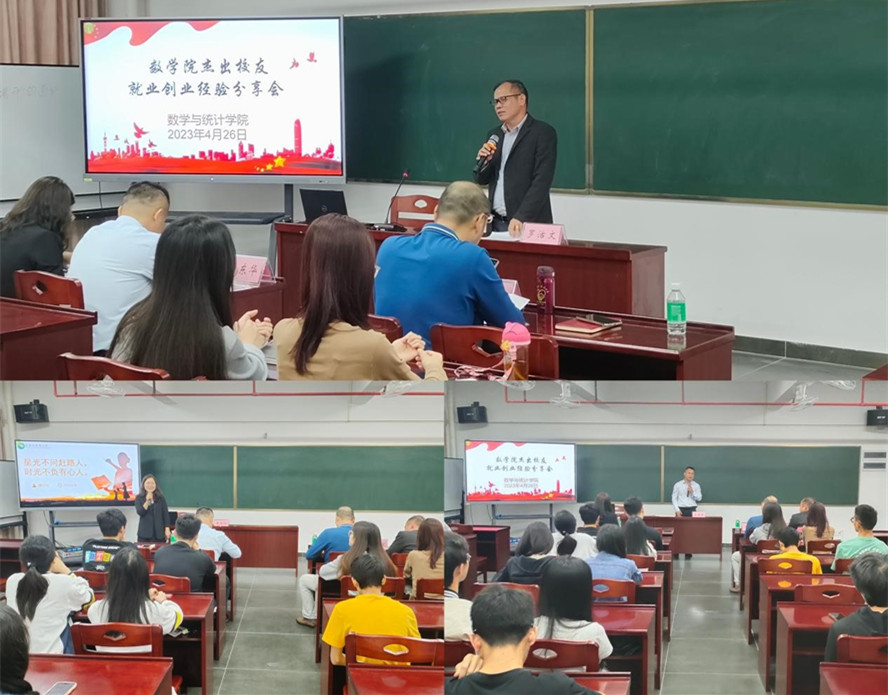 本网讯 4月26日,数学与统计学院在实训中心214举行以“就业创业经验分享”为主题的交流会,1988届校友、必赢242net官网东莞校友会常务副会长、数学院东莞校友会会长罗活文,1995届校友、数学院东莞校友会副会长区东华,2011届校友、东莞市麻涌中学高中数学一级教师潘巧玲出席,分享交流会由学院党委书记杨帆主持。
