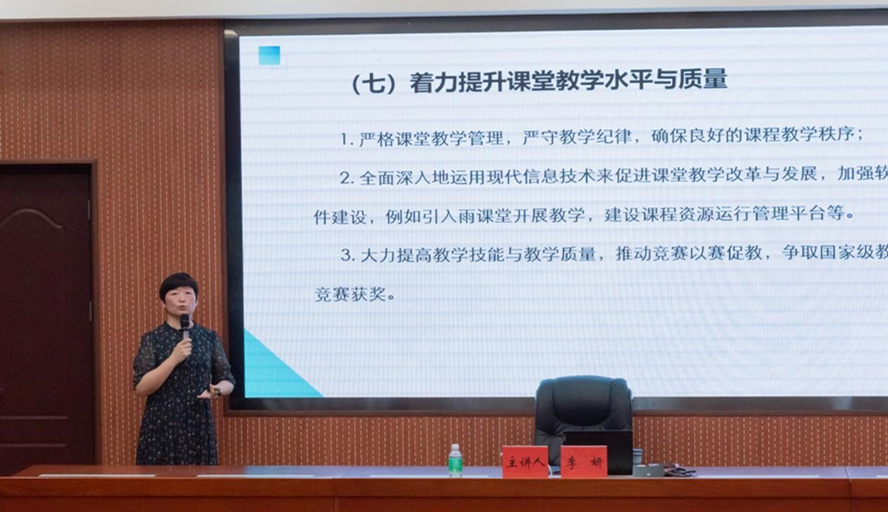 在教学专题培训会上,李妍以《必赢242net官网教学管理与教学改革发展情况简介》为题,详细介绍学校教学基本情况、主要教学管理制度和改革与发展方向的内容。她提出,教育的改革和发展需从七个方面不断优化,一是提升专业内涵,加强专业建设;二是以一流课程为抓手,推动课程建设;三是培育优秀教学成果;四是加强教学团队与基层教学组织建设;五是推动教学评价改革;六是实现“学生中心”理念,深化学分制改革;七是着力提升课堂教学水平与质量。她建议新教师要建立自己的学术、工作和社会体系,履行对学生学术、职业和生活的三个导向职责,做好教学的本职工作。