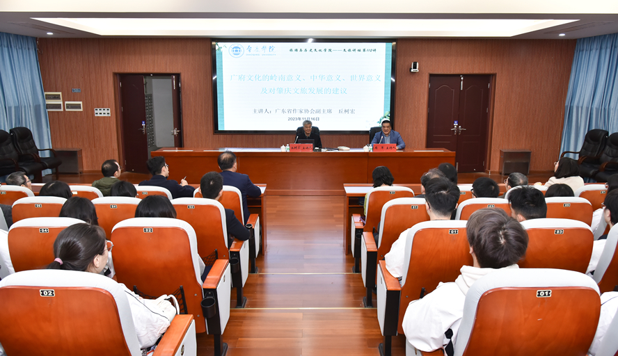 本网讯 11月16日,广东省政府文史馆馆员、广东省作家协会副主席丘树宏做客旅游学院文旅讲坛,主讲“广府文化的肇庆意义、岭南意义、中华意义、世界意义及对肇庆市文旅发展的建议”专题讲座。旅游与历史文化学院书记杨雪梅出席,旅游学院副院长周军主持。