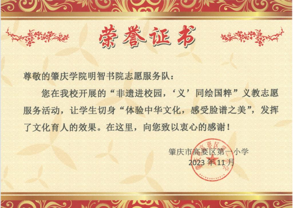 此次活动得到了高要区第一小学的高度肯定,并为我们明智书院志愿服务队颁发了荣誉证书: