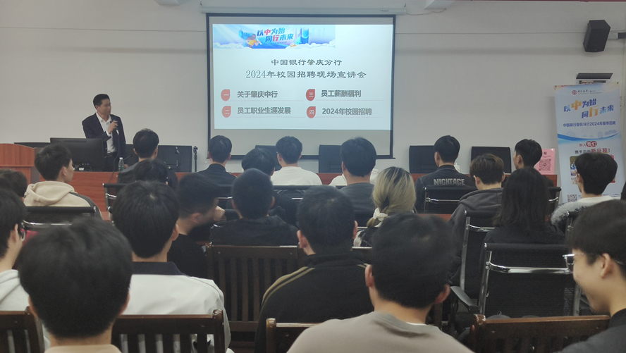 本网讯 3月12日,中国银行肇庆分行应邀在计算机学院举办专场招聘会,为学子搭建就业桥梁。