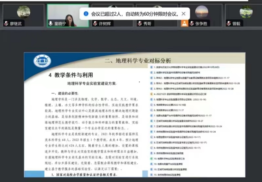 本网讯 近日,旅游与历史文化学院举行地理科学专业新增学士学位授予工作专家论证会。旅游学院副院长廖继武、地理科学系主任童晓宁以及地理科学系骨干教师通过线上线下相结合的方式参会。