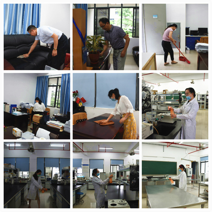 老师们分组对所在办公室或实验室进行彻底清扫,清除卫生死角,对地面等处进行消毒喷洒。老师们纷纷变身为保洁员,干劲十足,认真打扫。最后,实验室、办公室变得愈加整洁明亮,焕发生机。