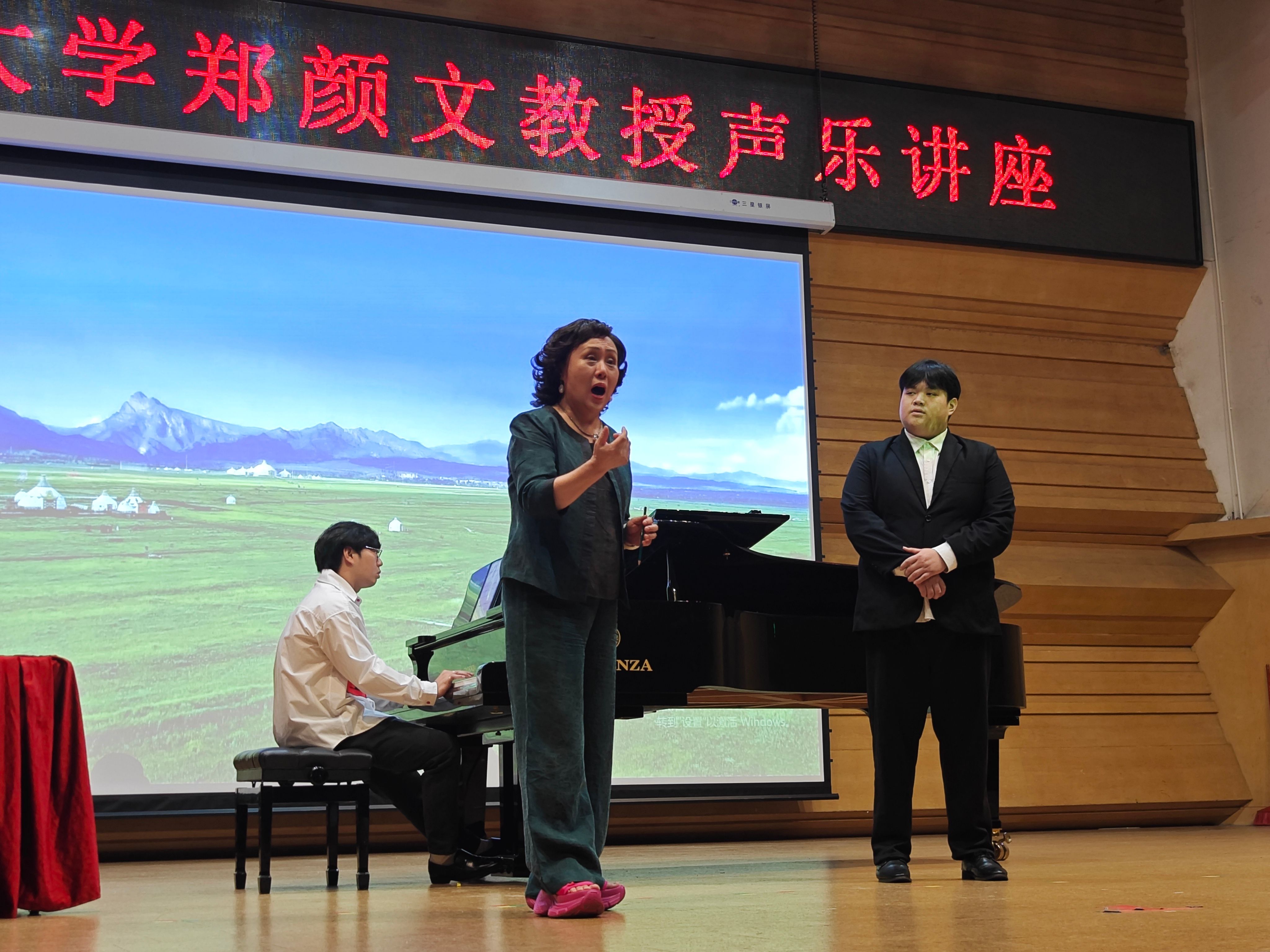 郑颜文教授声乐讲座分理论与实践指导两个部分进行。讲座围绕歌唱发声原理、歌唱的呼吸训练、歌唱舞台表现等多个方面展开理论授课。在演唱实践指导环节,郑颜文教授对音乐学院学生代表演唱的四首声乐作品逐一进行指导,并结合学生演唱的作品,向师生展开了细致的讲解和精彩示范。