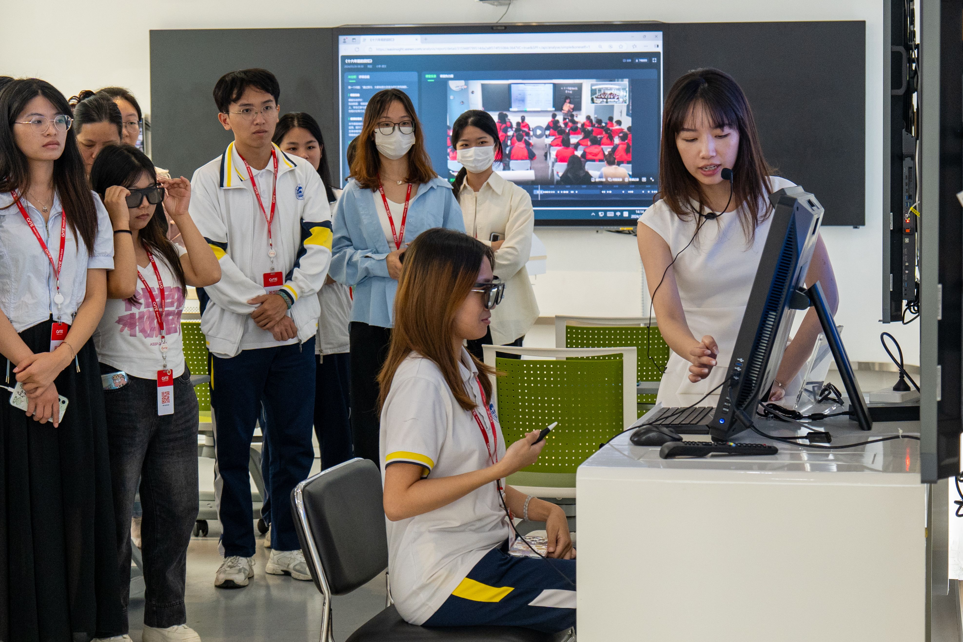 师生一行人前往广东工业大学参观了图书馆的学习环境、视听空间和信息共享空间。在希沃公司,师生与产品研发人员就软件的应用场景、AI师范生技能大赛实训、希沃课堂智能反馈系统解决方案展开研讨,并现场进行模拟授课。