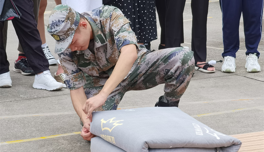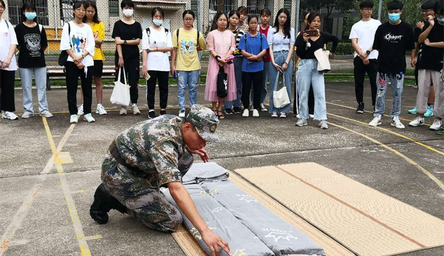 叠被子是宿舍内务整理的重要部分,对宿舍整洁起到重要提升作用。为了让新生能够叠出如军营中一般标准的被子,退伍老生分步骤为新生进行演示,边示范边指出动作重点和要领。对折、虚部掏平、压平、两次对折等步骤后,“豆腐块”的大体形状便出现了,再经过 “三分叠七分修”,标准的军被便呈现在大家眼前。在场的新生鼓掌称赞。