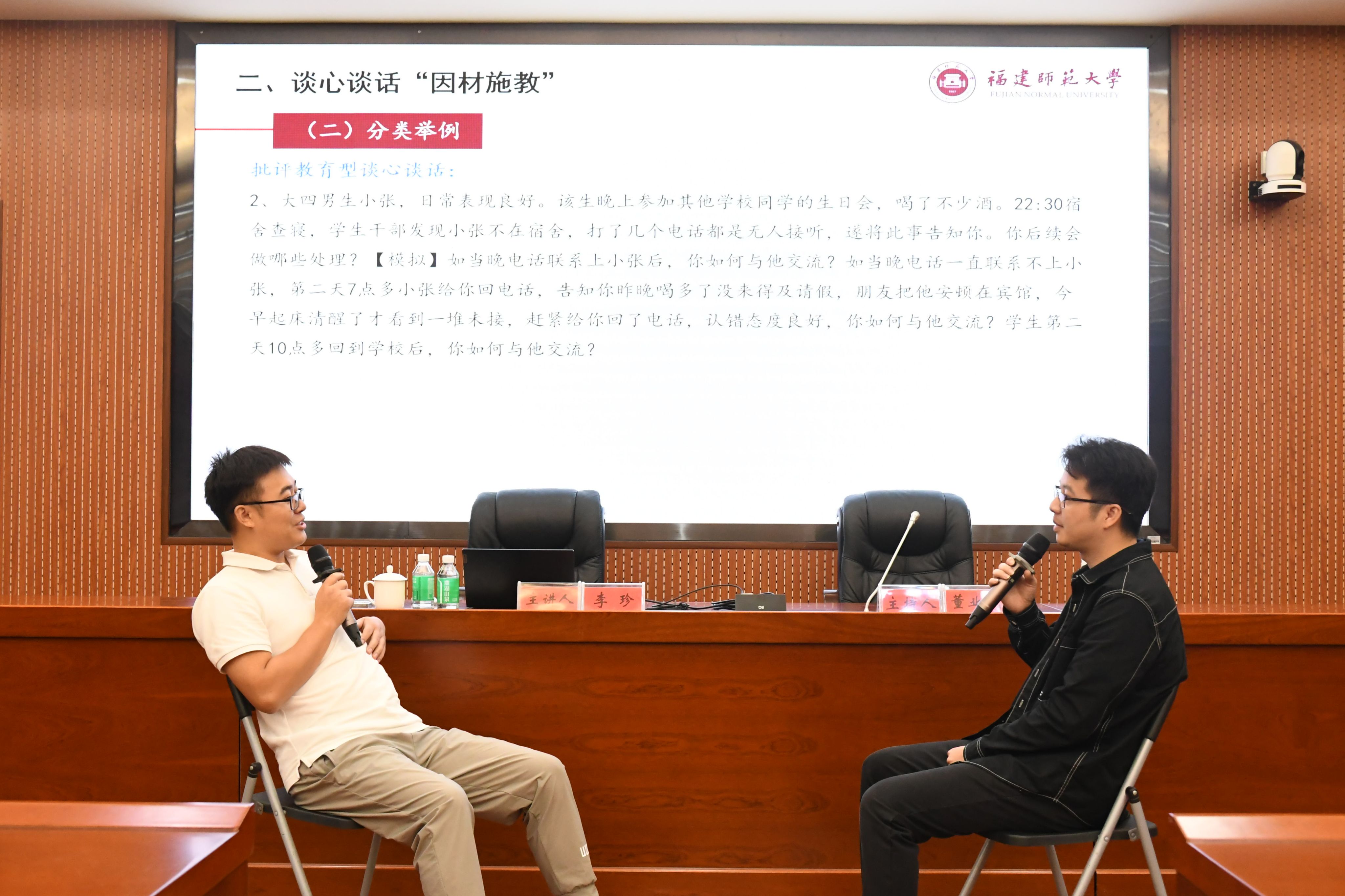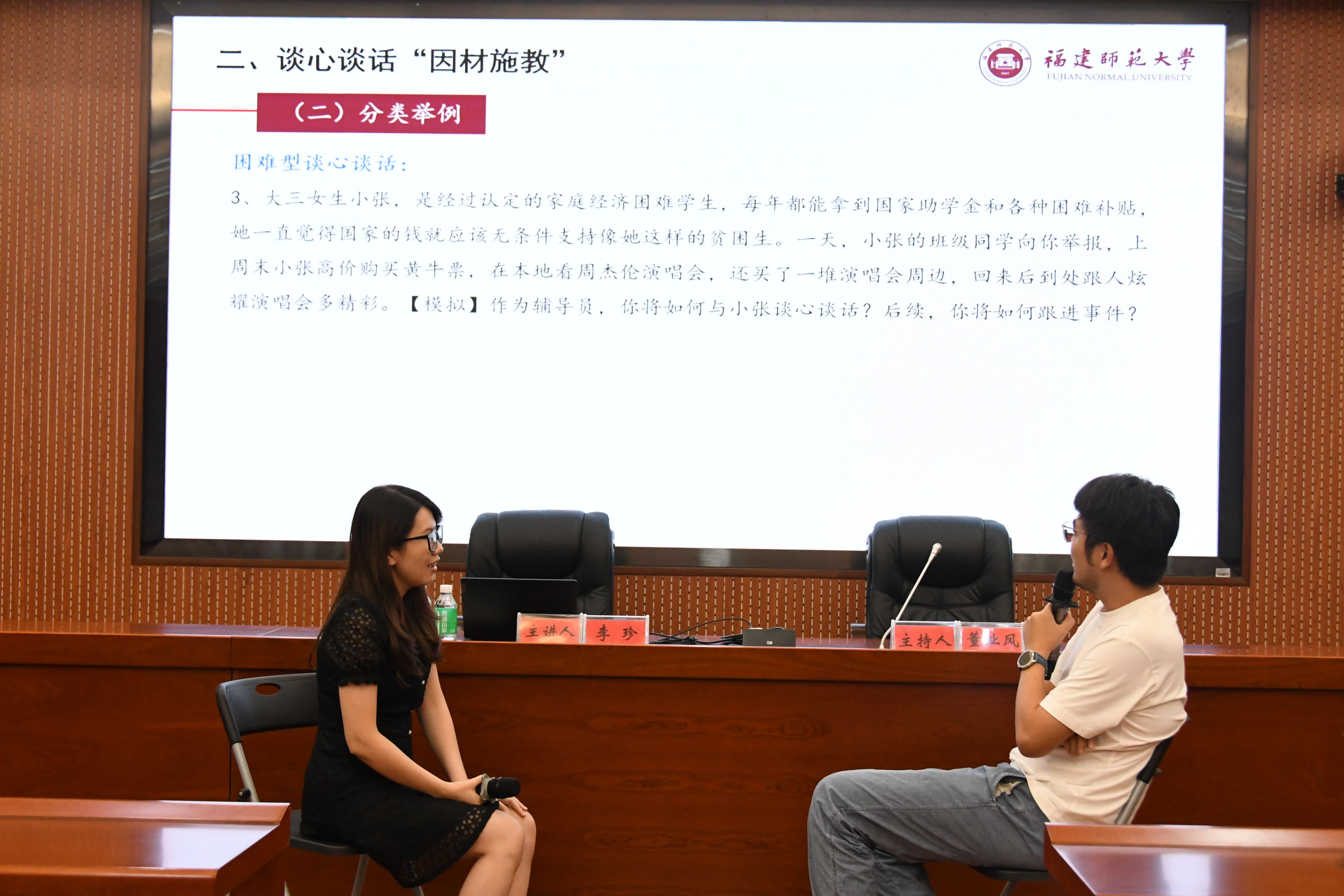 李珍以“我眼中的谈心谈话”为引,列举了谈心谈话的多种类型以及在实际工作当中可能遇到的问题。她强调,谈心谈话应通过交流和倾听来洞察对方的真实想法和心理状态,并注重沟通技巧以实现预期效果。在案例分析与实操演练环节,李珍深入讲解了谈心谈话的通用技巧,包括影响谈心谈话效果的相关因素、有效开展谈心谈话的方法、能力提升的路径等。她指出,高校辅导员应从经验中学习、从知识中提炼、从技巧中吸收、从榜样中成长,以丰富谈心谈话工作的内涵和增强自信。
