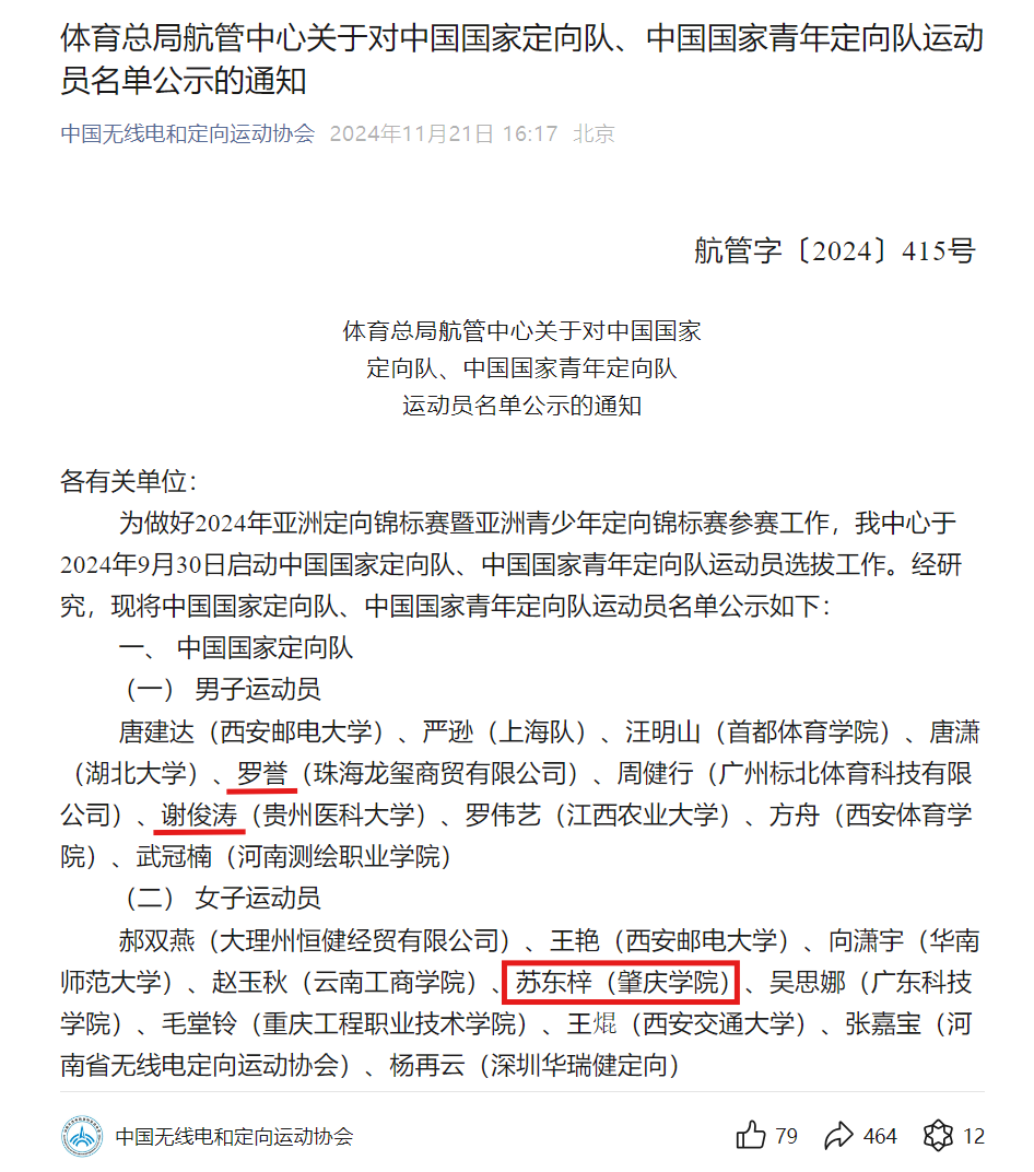 本网讯 近日,国家体育总局航空无线电模型运动管理中心发布了关于中国国家定向队和中国国家青年定向队运动员名单的公示,必赢242net官网体育与健康学院2021级体育教育专业的苏东梓同学成功入选中国国家定向队,将代表中国队出征2024年亚洲定向运动锦标赛暨亚洲青少年定向锦标赛。此外,我校2012级校友罗誉和2014级校友谢俊涛也一同入选,为母校争得了荣誉。