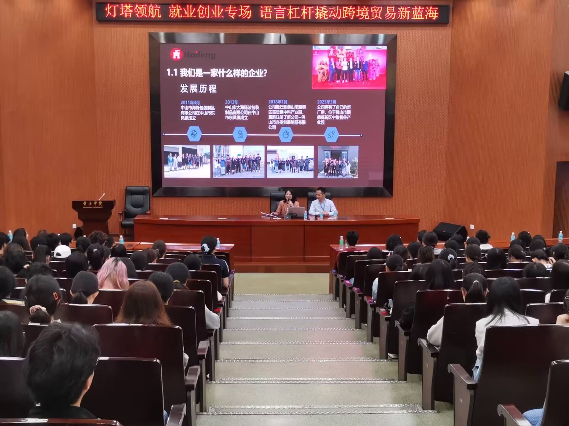 本网讯 3月12日,外国语言文化学院特邀佛山市亦朋包装制品有限公司创始人、2007届优秀校友伍志锋以及该公司外贸经理、2017届毕业生赖科蓉回母校开展招聘和宣讲。学院党委书记卢咏,毕业生班主任、全体辅导员参加。党委副书记杨琼主持分享会。活动吸引了近400名师生参与。
