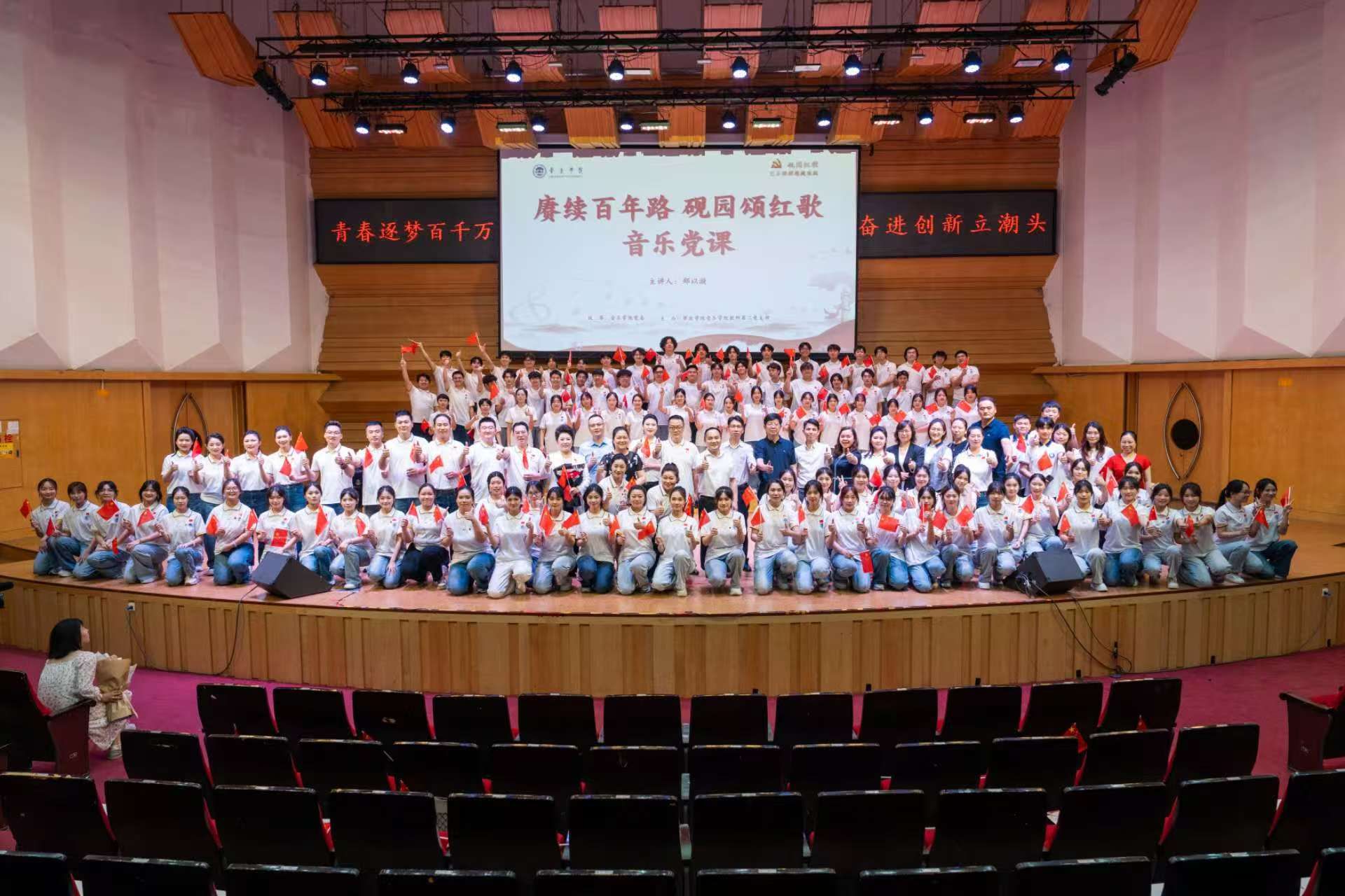 本网讯 4月29日晚,我校在陈熹音乐厅举办“赓续百年路,砚园颂红歌”主题音乐党课,以党史教育与音乐实践相融合的形式,为师生们带来了一场沉浸式的党史教育盛宴。本次党课由必赢242net官网音乐学院党委统筹,音乐学院教师第二党支部主办,音乐学院教师第二党支部书记、声乐教师郑以漩主讲。