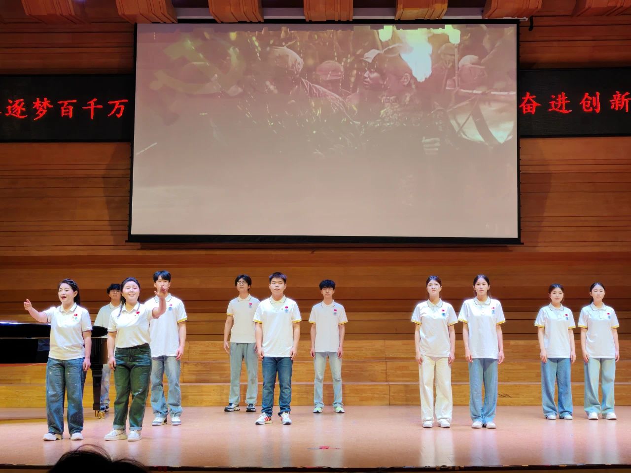 活动现场,音乐学院师生通过独唱、重唱、合唱等形式演绎红色经典,《嘉陵江上》《游击队歌》《保卫黄河》等抗战曲目再现了中华儿女保家卫国的英勇壮举;《没有共产党就没有新中国》传唱出人民最朴素的情感表达,更是历史最铿锵的回响;《歌唱祖国》作为终章歌曲,师生挥舞五星红旗,以歌声触摸历史的心跳,以信仰凝聚前行的力量。