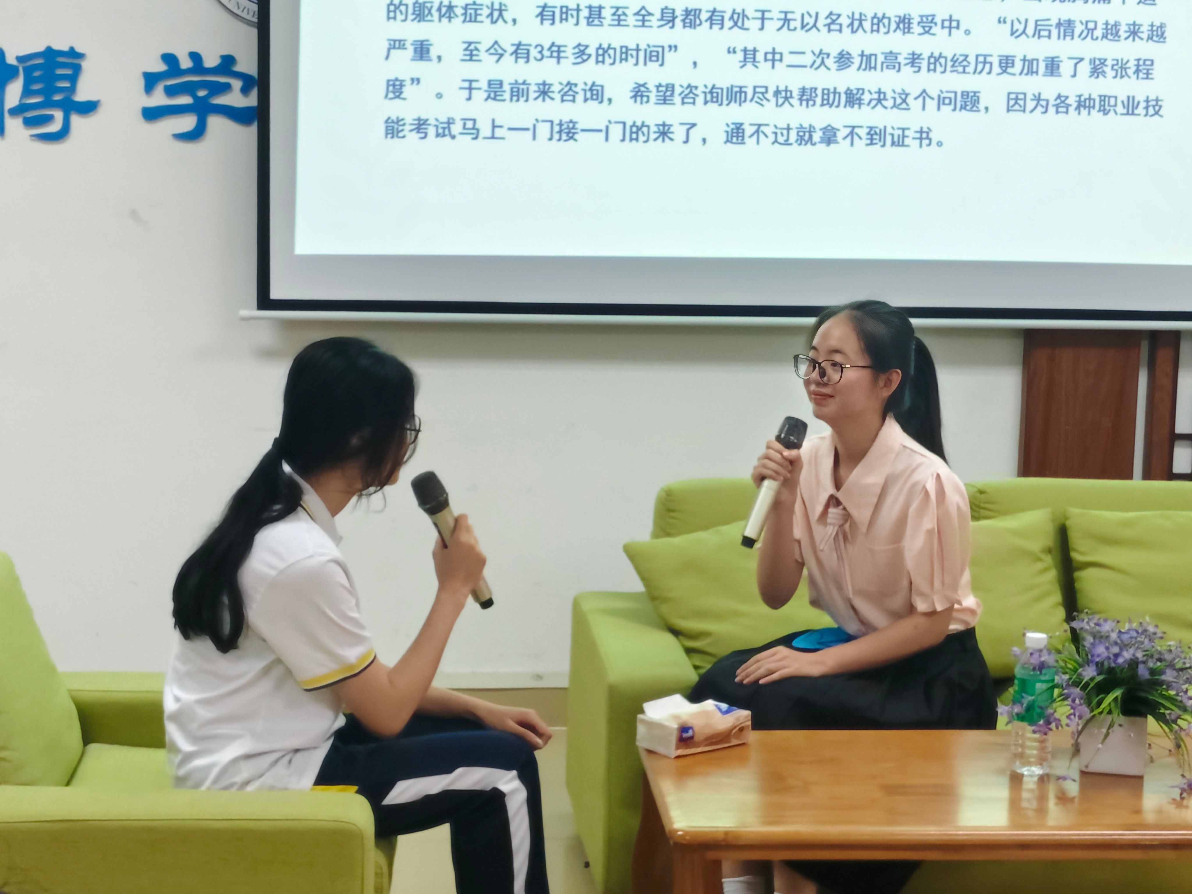 决赛采用现场模拟咨询形式,分为专业组和非专业组,参赛选手现场抽取案例对来访者进行心理咨询,运用心理学知识和朋辈心理辅导技巧给来访者进行心理疏导,帮助他们解决所面临的心理困惑。评委老师分别对获奖选手颁奖并点评,对选手们的出色表现给予高度肯定,并提出了切实可行的改进建议,为在场师生带来了一场专业且实用的心理辅导知识盛宴。