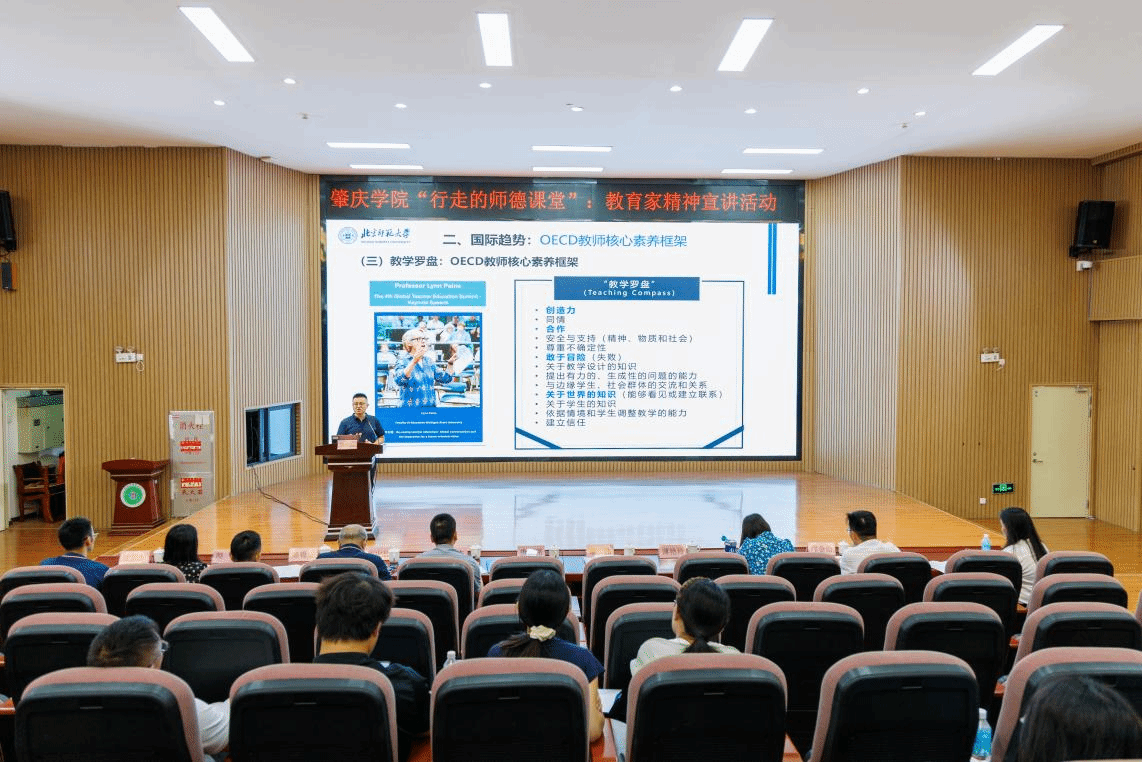 6月18日,面向教师教育改革创新实验区和协同育人合作区顶岗实习生及基地指导教师的“行走的师德课堂:教育家精神宣讲活动”在四会市玉城学校正式启动。廖伟从OECD教师核心素养框架出发,为教育家精神赋能教师专业发展提供国际视野;肇庆教育研究院曲中林教授深入阐释教育家精神的时代内涵与行动路径;怀集县桥头镇初级中学校长邝金山分享乡村教育的“仁爱”坚守;肇庆一中高级教师颜冬展示“立德树人”的一线实践,为教育家精神注入鲜活生命力。