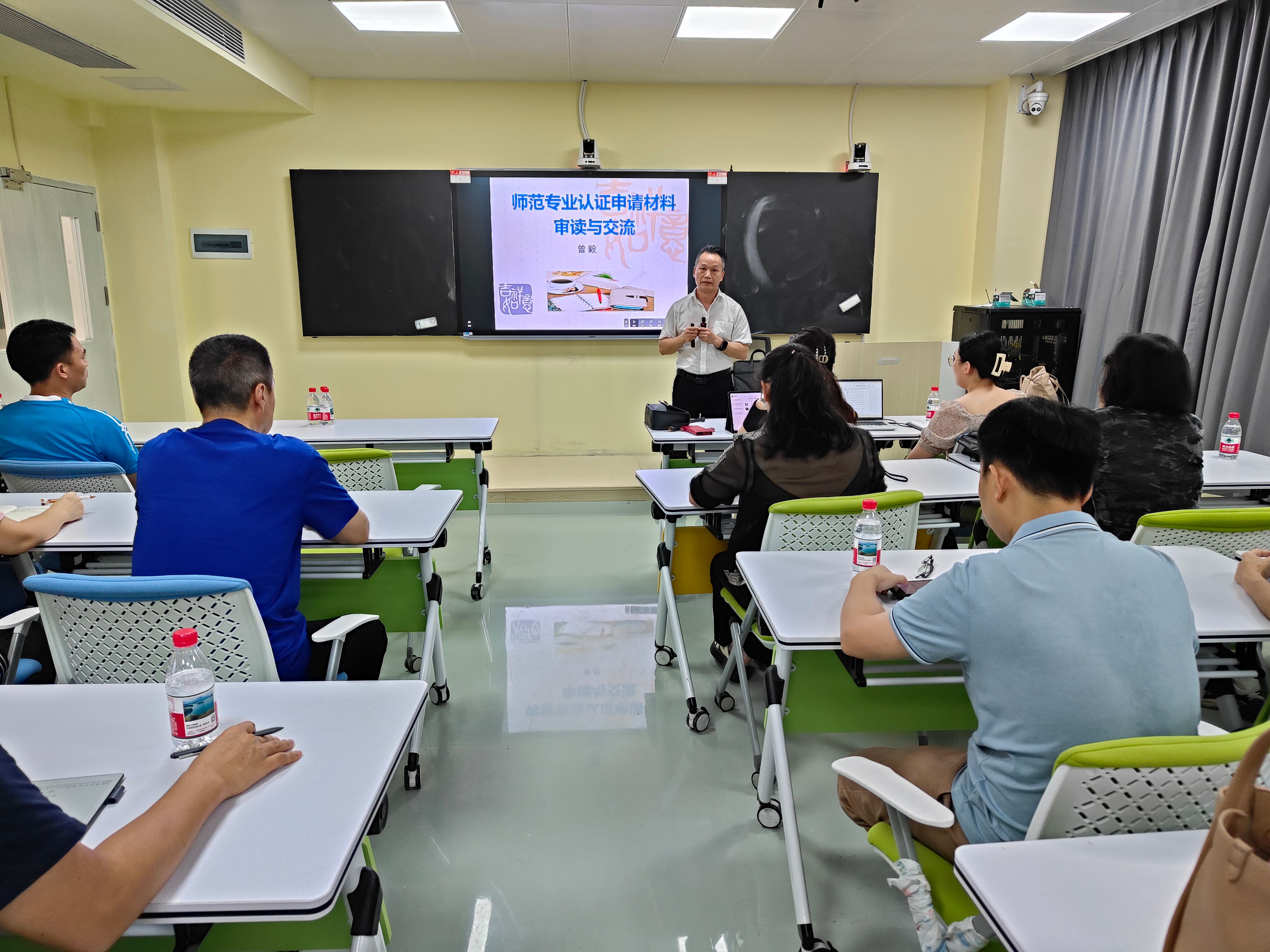 会上,李佩环对学校师范类专业认证工作进行了布置,要求各学院高度重视认证工作,利用假期对认证申请材料进行补充完善。评估中心副主任曾毅围绕专业认证申请材料的审核要求、认证主线与底线的审核要点、专业认证申请书的撰写方法,对五个专业的申请书撰写及其申报材料存在的问题进行了针对性辅导。